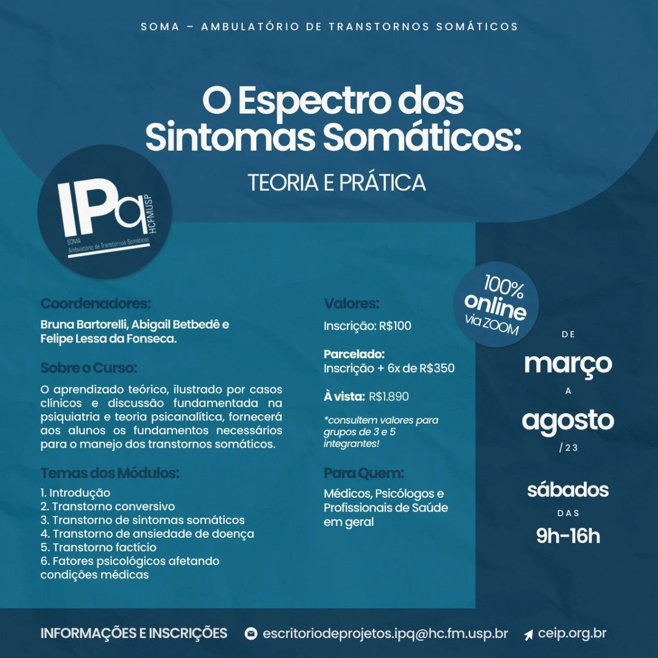 O curso será destinado a profissionais de saúde e oferecerá uma breve introdução teórica aos transtornos somáticos e discussão do manejo a partir de casos clínicos. O objetivo do curso é proporcionar o reconhecimento precoce de quadros de transtornos somáticos e princípios básicos no atendimento de pacientes com estes quadros.
